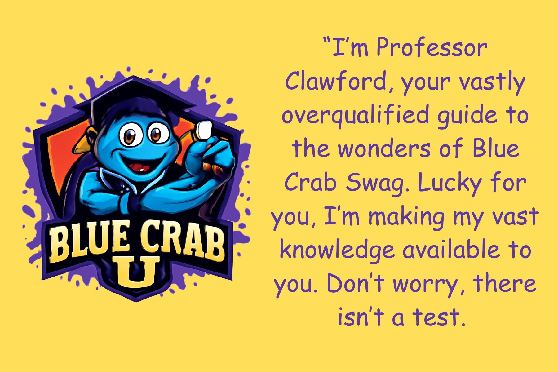 “Wanna know more about our products, options, and which one’s the catch of the day? Scuttle on over to Blue Crab University! Professor Clawford is waiting with a tuition-free crash course in crab-tastic knowledge. No textbooks, no tests—just claws, laughs, and the inside scoop on what’s best for you!”