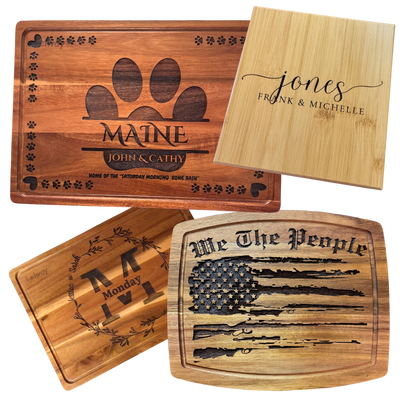 Most of our customers do not use engraved boards as kitchen tools. Instead, they are used as a display or serving piece. But, just as anything else used regularly, you will see the effects of use. Sharp serving utensils and knives WILL CAUSE COSMETIC DAMAGE. If you want to use an embellished board but protect the embellishment, you can turn the board over and use the back side. We apply food-safe mineral oil to our embellished finished products. It is recommended that you use food-grade mineral oil, beeswax, or a blend to help protect your board. Follow the instructions provided on the product you choose. Some manufacturers also suggest it is acceptable to use vegetable oil, soybean oil, or olive oil. It is best to avoid storing your board in humid or hot places. This could result in reducing the hardness of the wood.