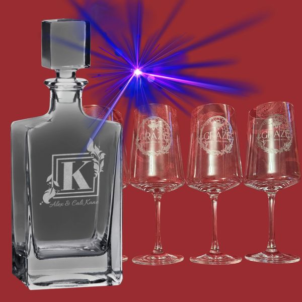 Laser etching is a decorating process that etches a pattern into the glass, giving it a subtle tone-on-tone appearance. The etching design has a slight grayish tone. The etching can be blackened which gives the design a darker gray to black appearance. It works well with both big and small logos. High resolution vector images/graphics are ideal.